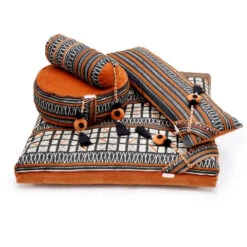 Versatile and supportive, this bolster provides a beat for your yoga poses. Get grooving with Dandiya-inspired chattra design in black and white with intricate stitching and plush amber velvet–all topped off with a coordinating tassel. A divine choice for pranayama breath practice, restorative, and yin yoga support.