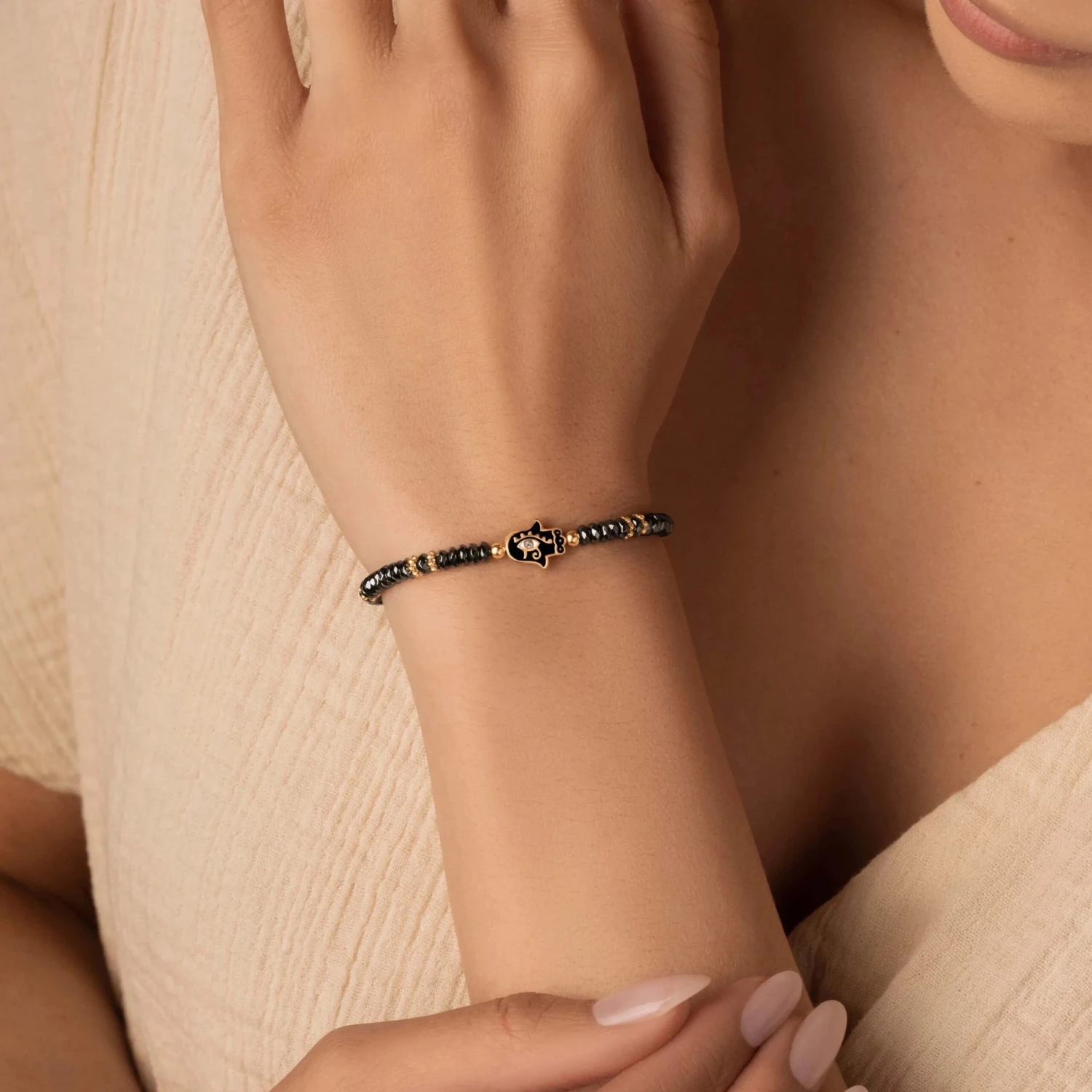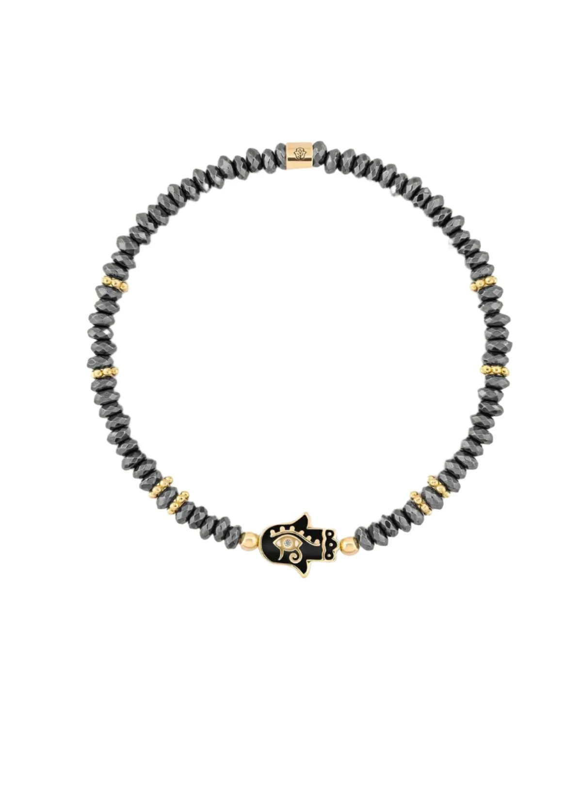 Elevate your spiritual journey with the Karma and Luck Eye of Horus Hamsa Hematite Bracelet. This unique bracelet features a Black Enamel Hamsa for protection, encircled by Hematite stones known for their grounding and shielding properties. The Eye of Horus is a powerful symbol of intuition, enhancing your inner guidance and spiritual awareness. Made in Thailand by local artisans, this bracelet is perfect for those looking to combine style, protection, and intuition in one beautiful accessory.