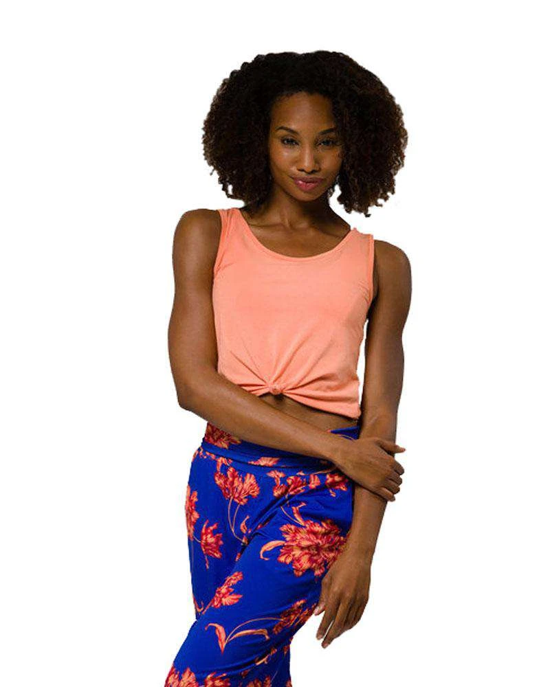 The Onzie Knot Top is made from jersey spandex for a soft, stretchy feel. It easily ties in front for a cropped look, and the scoop neck gives you an open neckline that will let you breathe.Â
