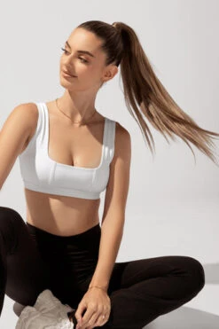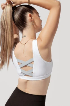 Featuring a wide square neckline, an elegant criss-cross back design and faux boning princess seams at the bust to contour and accentuate your bust, the Corset Bra is drama in a sports bra.