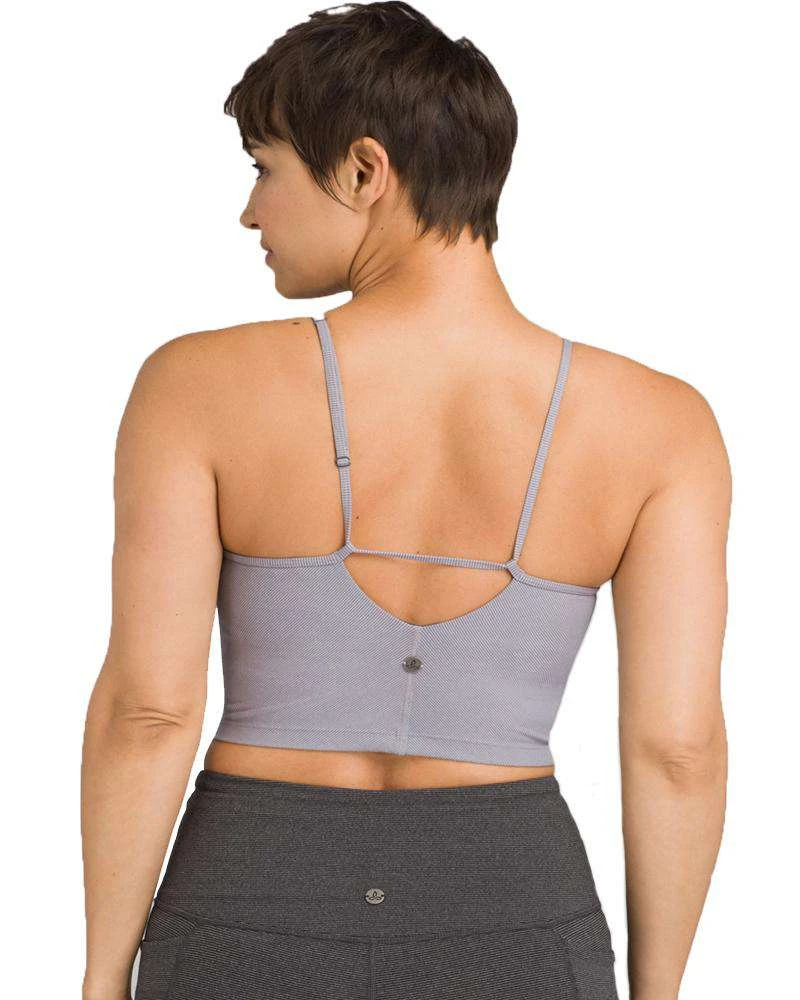 Prana’s Prado Sports Bra is cami-style with brushed elastic, stretch jersey fabric, and adjustable straps. Its open back detail and molded cups give you the shape you want with the support you need.